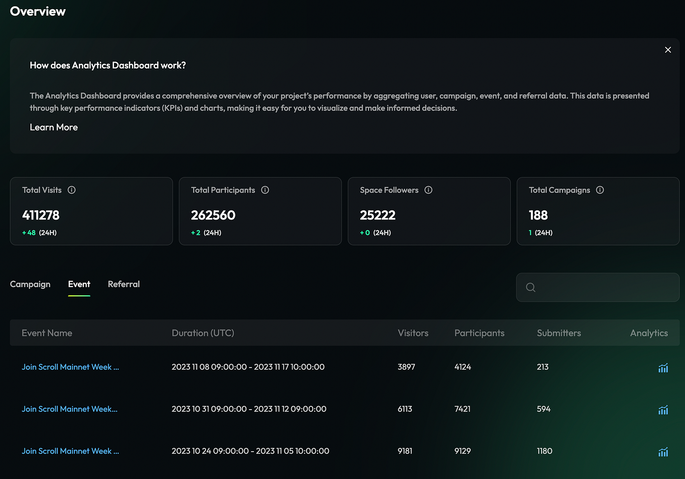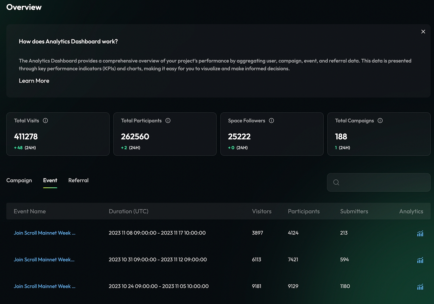 TaskOn’s Analytics Dashboard is a powerful tool designed to elevate your project’s performance by providing in-depth insights through on-chain, off-chain, social, and governance data aggregation. Easily visualize key performance indicators and conduct multi-dimensional analyses for Campaigns, Events, and Referrals. Enjoy real-time data updates, enabling swift responses to market changes, and utilize the interactive charts to track metrics such as Visitors, Participants, and Conversion Rates. Accessible through the Entity Hub, the Analytics Dashboard empowers you to optimize your activities, boost engagement, and enhance overall project success.