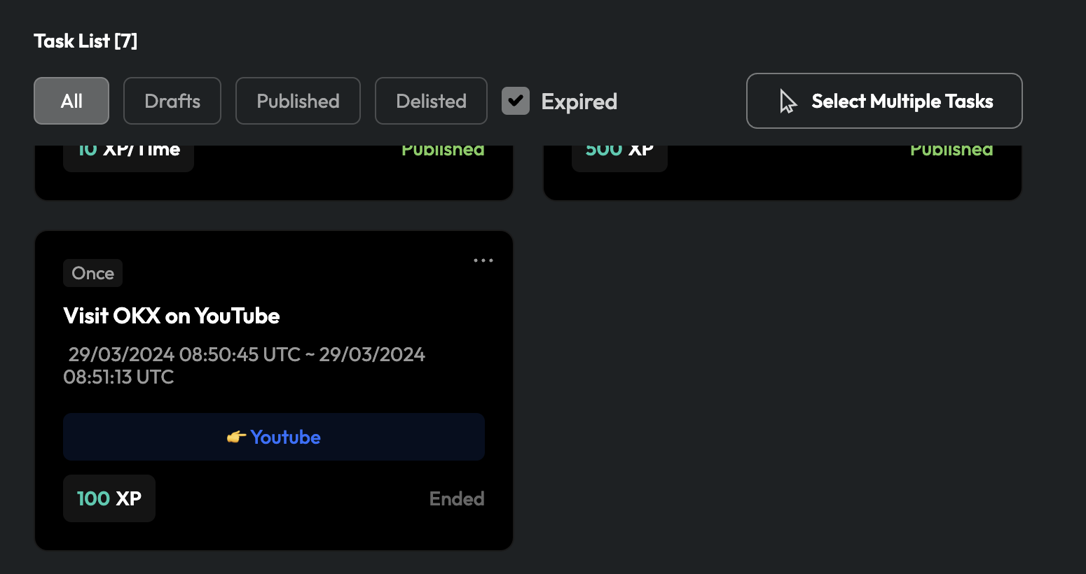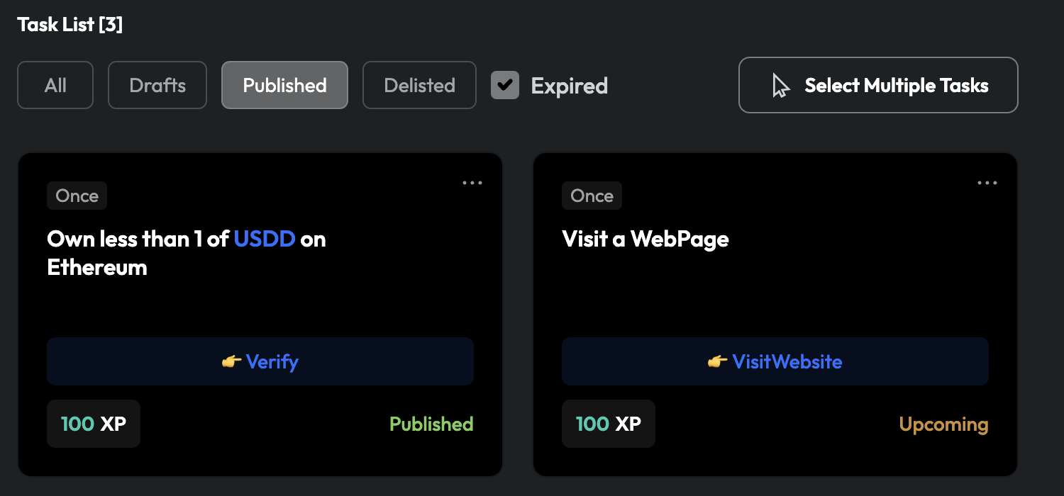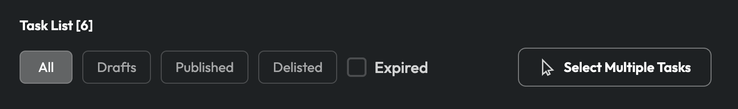 * `Published`: Tasks that are about to go live (`Upcoming`), have successfully gone live (`Published)`, or have ended (`Ended`).