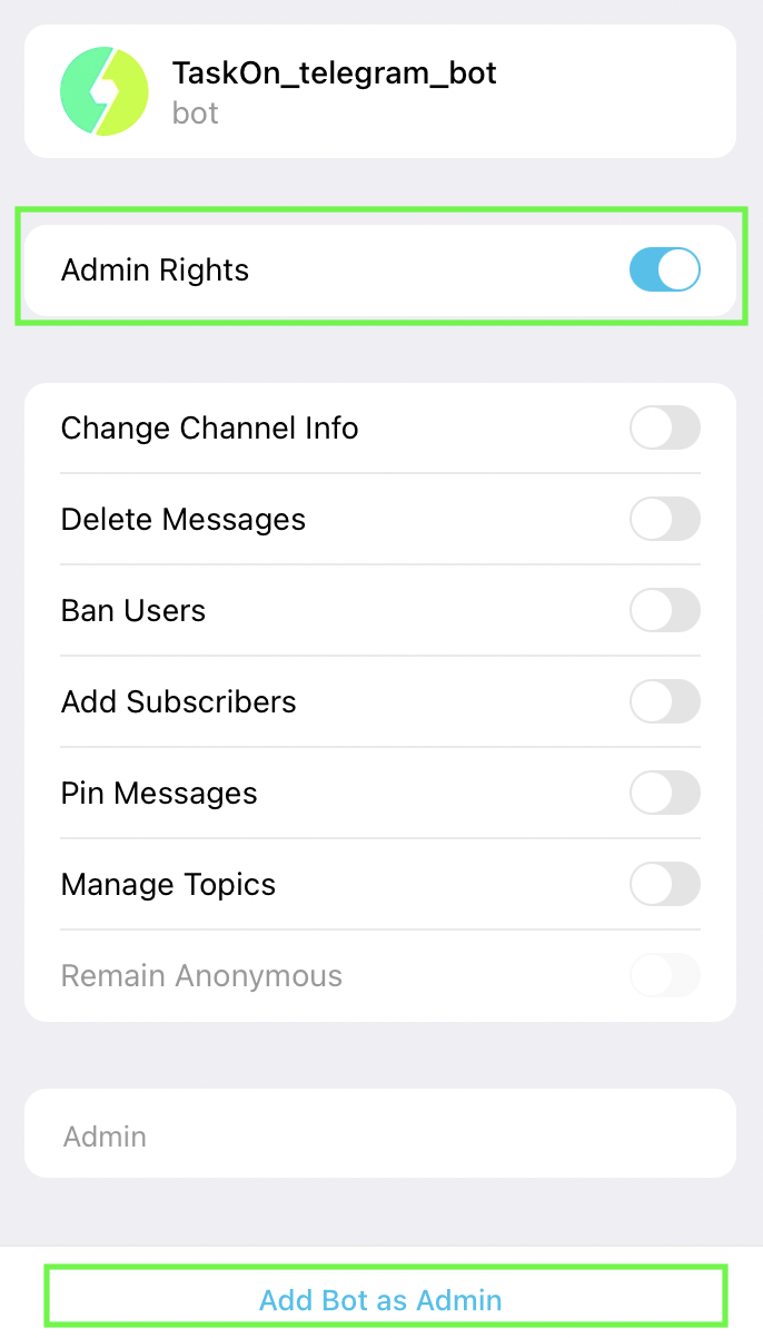 4. Click "`Admin Rights`", and then click "`Add bot as admin`".