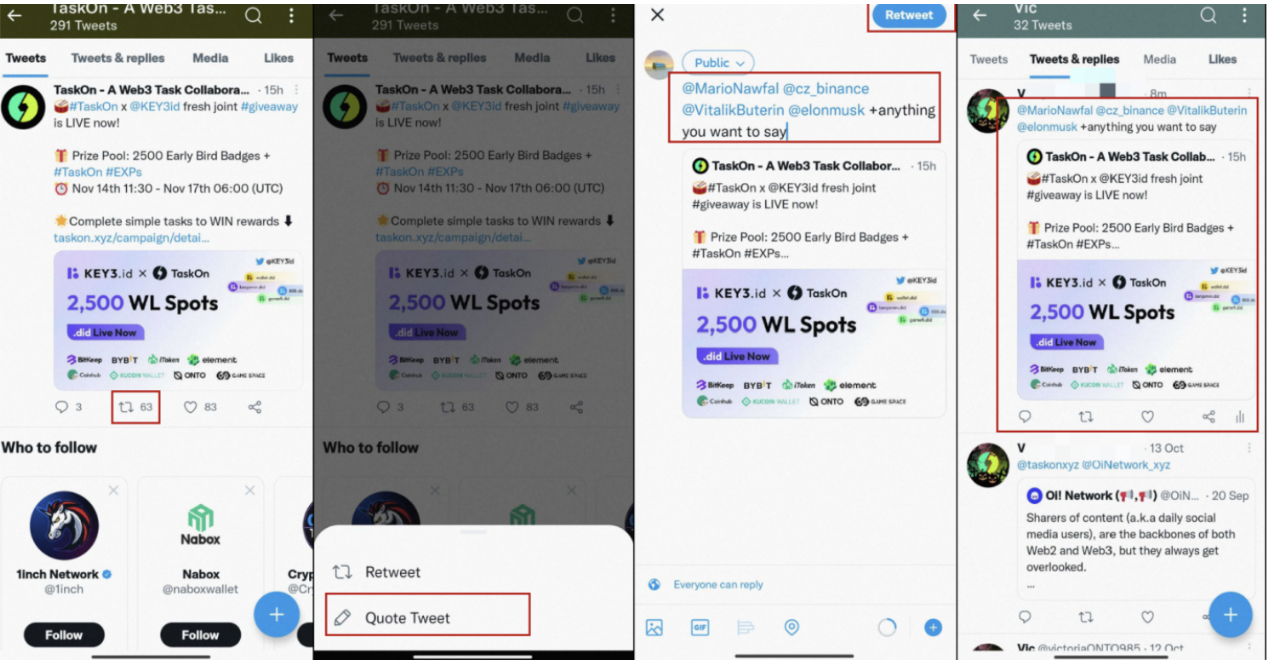 If you are experiencing issues with validating your quote tweet task, please ensure that you are using the "Quote" function and tagging the specified users, rather than using "`Reply`". You can refer to the picture tutorial below for guidance: