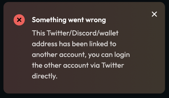 This happens when you try to bind your Twitter/Discord account to a wallet address that is already linked to another Twitter/Discord account. Each wallet address can only be linked to one Twitter/Discord account. If you want to switch the linked account, you'll need to first unlink the old account from the wallet address, then log in with the new account and link it. Note that you can only switch bindings **once a month**.