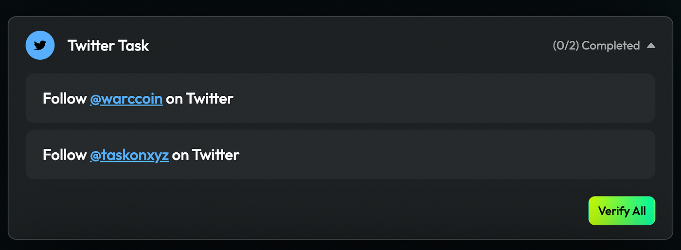 No need to verify each task one by one anymore. Now, after completing all the tasks within a campaign, simply click on “Verify All”. This fantastic feature currently applies to all Twitter tasks. Enjoy the convenience and efficiency like ever before.